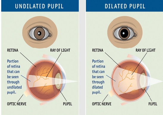 Cu ajutorul acestui test, medicul oftalmolog poate vizualiza retina, vasele de sânge și nervului optic. Pentru asta, este nevoie de dilatarea pupilei cu picături care modifică vederea. Când pupilele sunt dilatate, pacientul va fi sensibil la lumină și se va confrunta cu dificultăți de concentrare în vederea la apropiere. Aceste efecte pot dura până la câteva ore, în funcție de picăturile folosite. De aceea, cei care efectuează acest test nu trebuie să conducă pentru câteva ore și să poarte ochelari de soare.